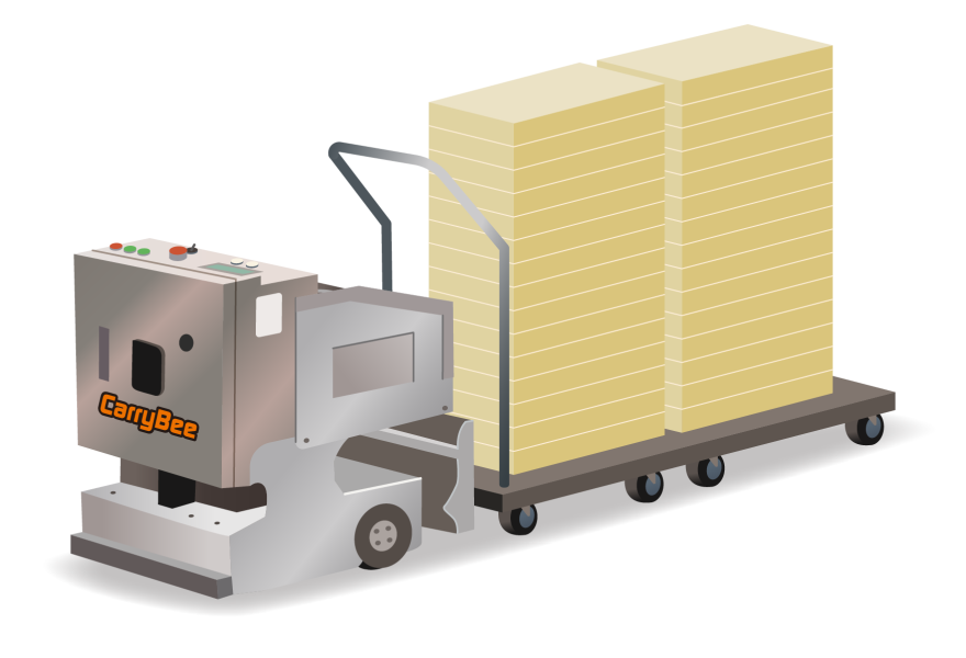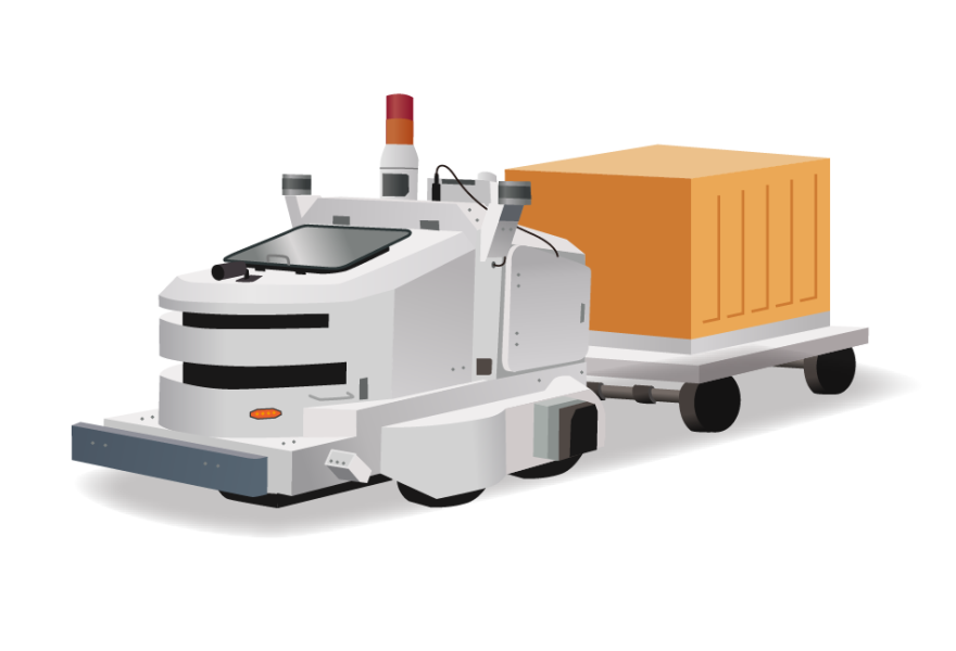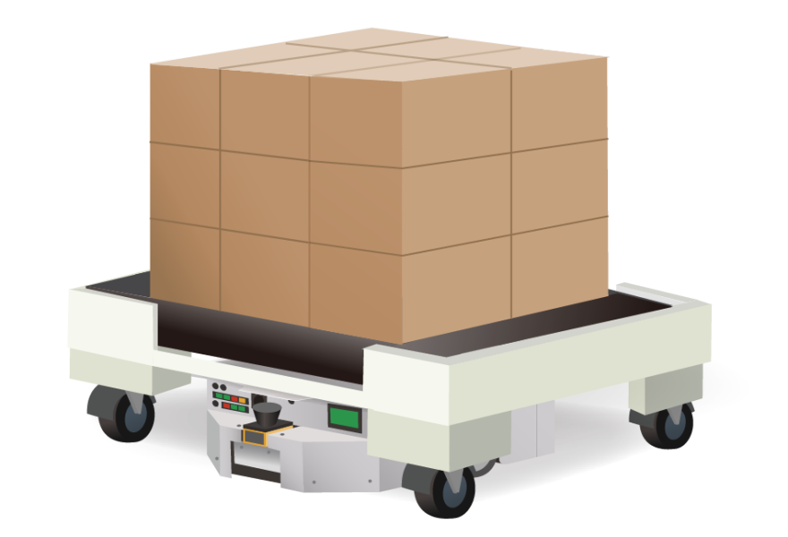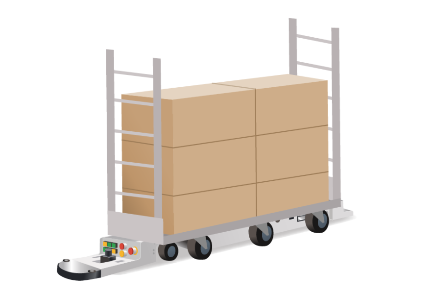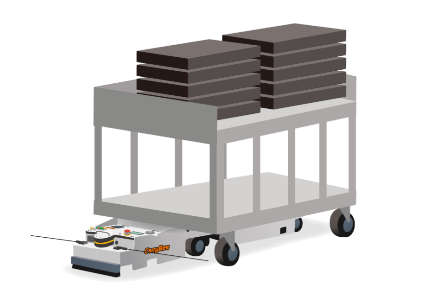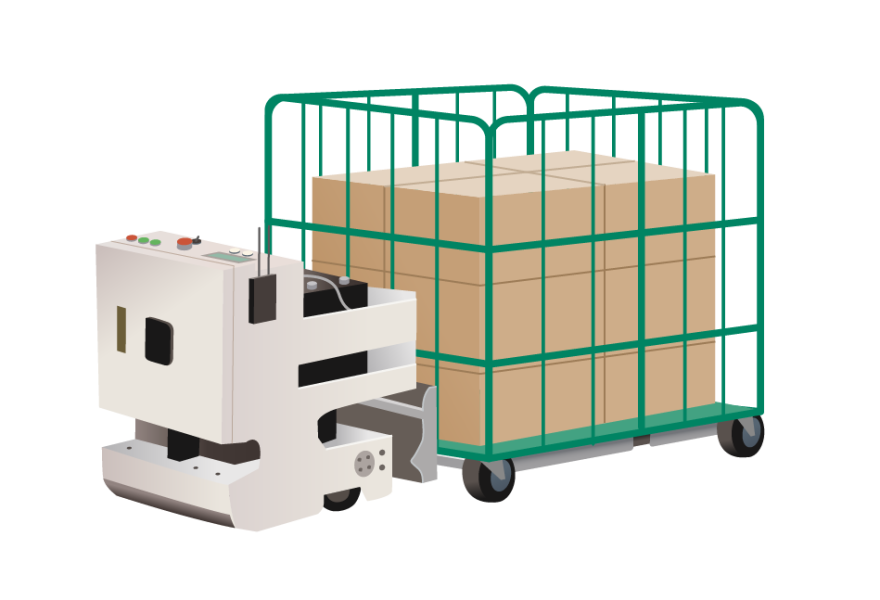 食品工場での無人搬送には他の製造工場とは異なる環境があります。水の飛散に対する防錆、電装系の保護、また床の水たまりによるスリップへの対応が必要になります。また作業場付近の通路が狭くAGVが最終目的地まで到達できないため、AGVから切り離したのち簡単に目的地まで作業者が運べる方法が有効となります。