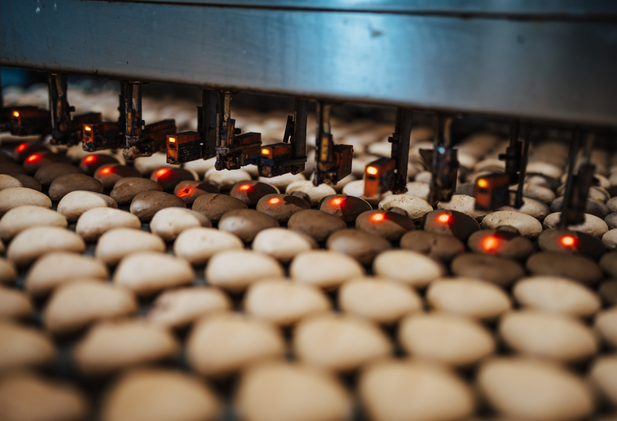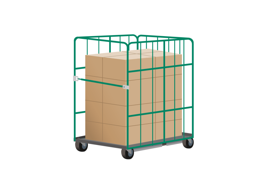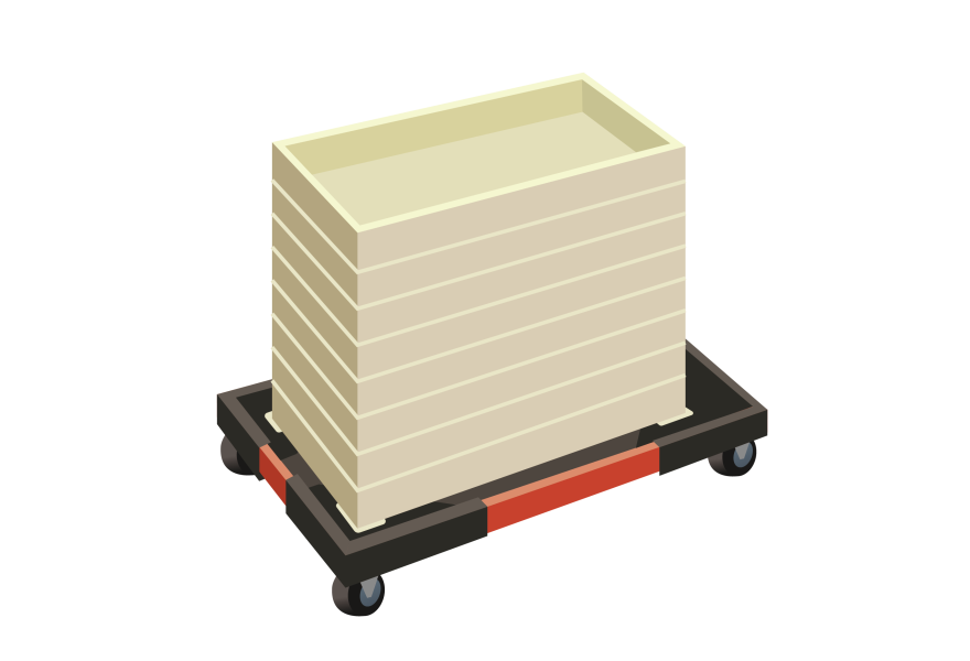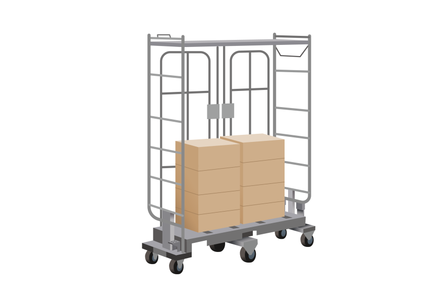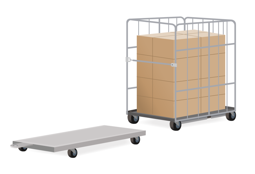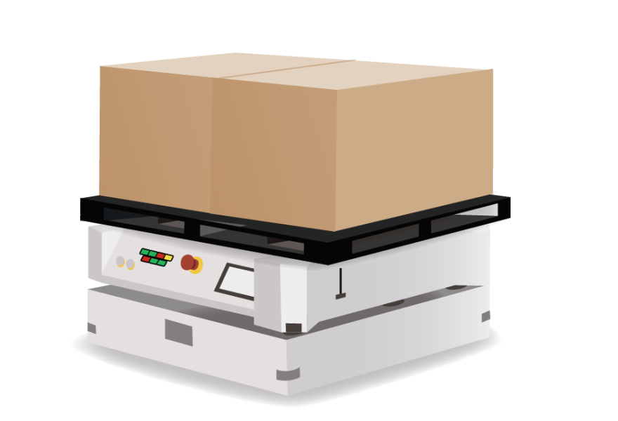 食品工場での無人搬送には他の製造工場とは異なる環境があります。水の飛散に対する防錆、電装系の保護、また床の水たまりによるスリップへの対応が必要になります。また作業場付近の通路が狭くAGVが最終目的地まで到達できないため、AGVから切り離したのち簡単に目的地まで作業者が運べる方法が有効となります。